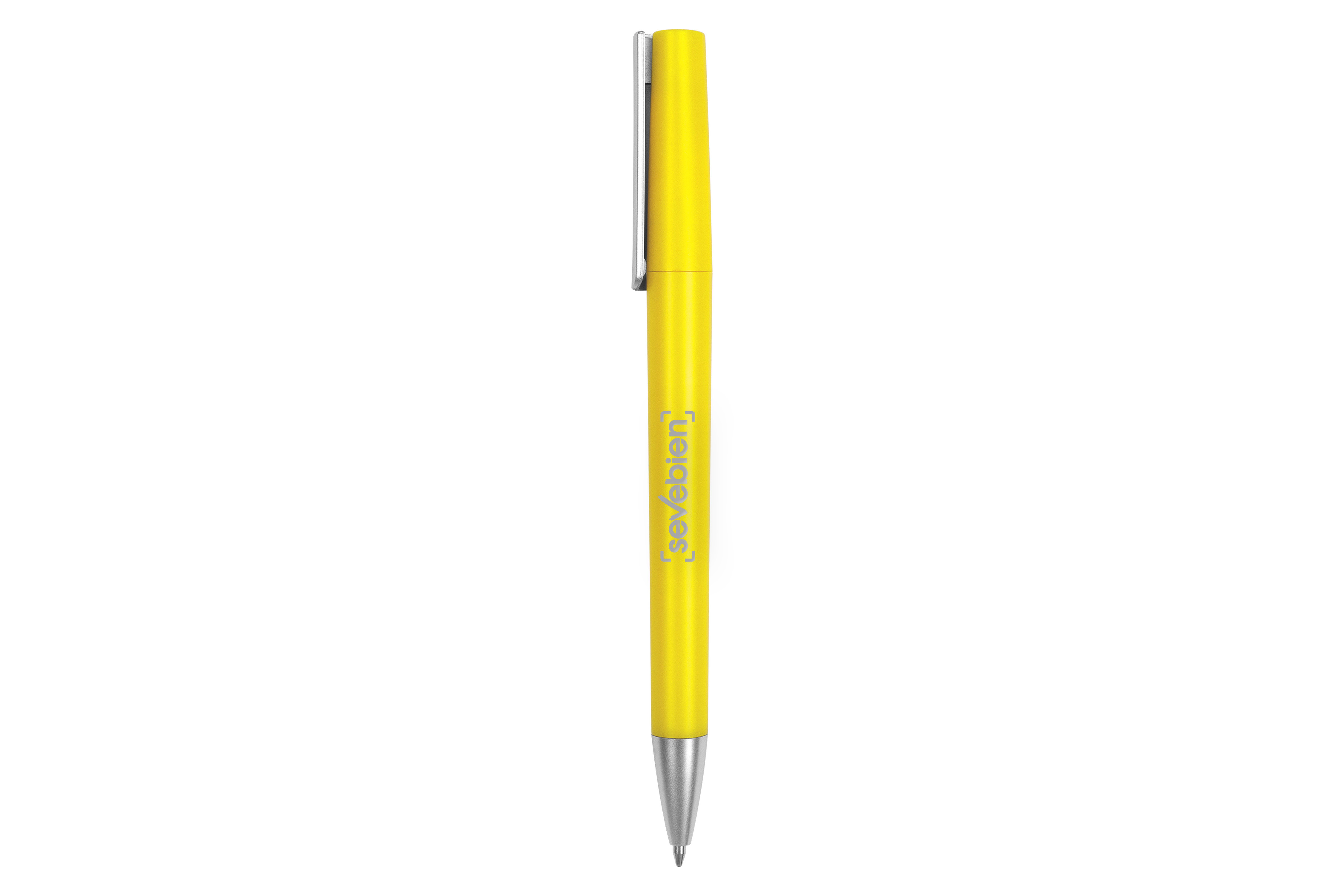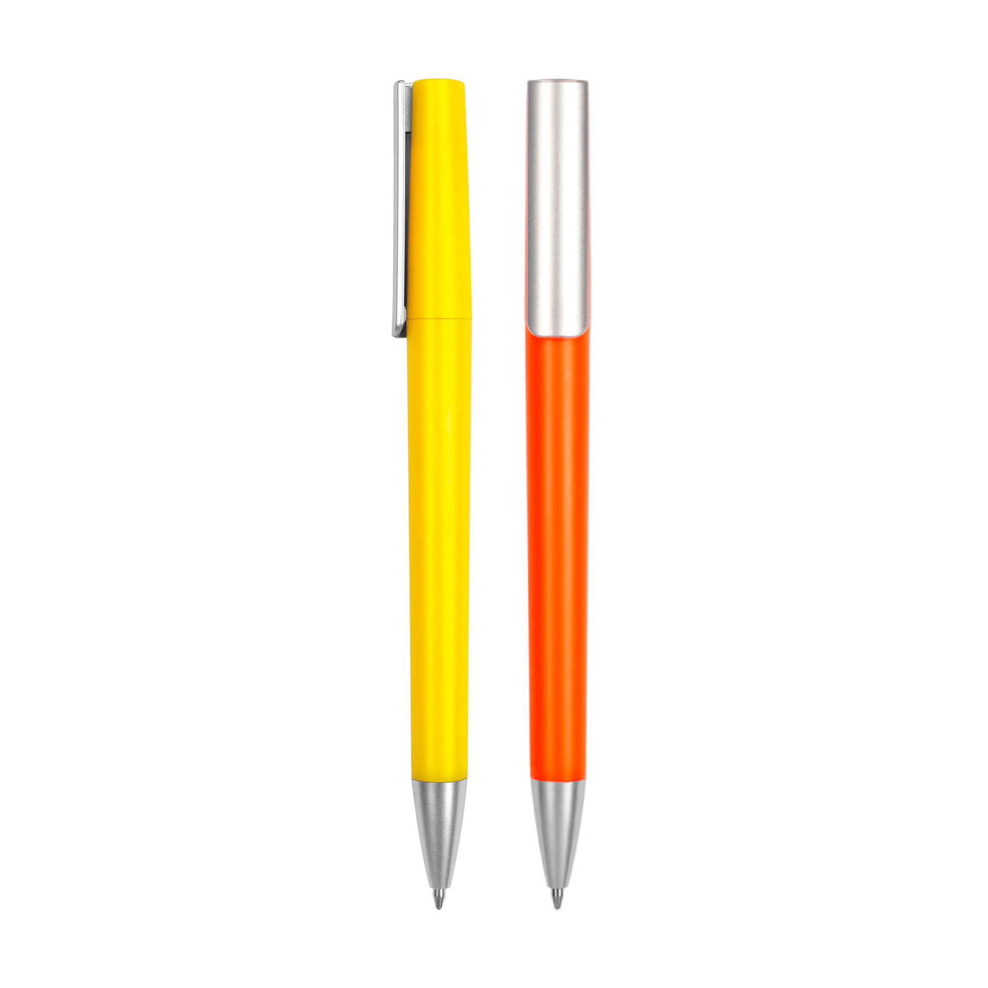 Ø 0,5 x 13,5 cm. Bolígrafo plástico . Cuerpo de color. Detalles de color plata en clip y puntera. Apertura giratoria. Tinta negra.