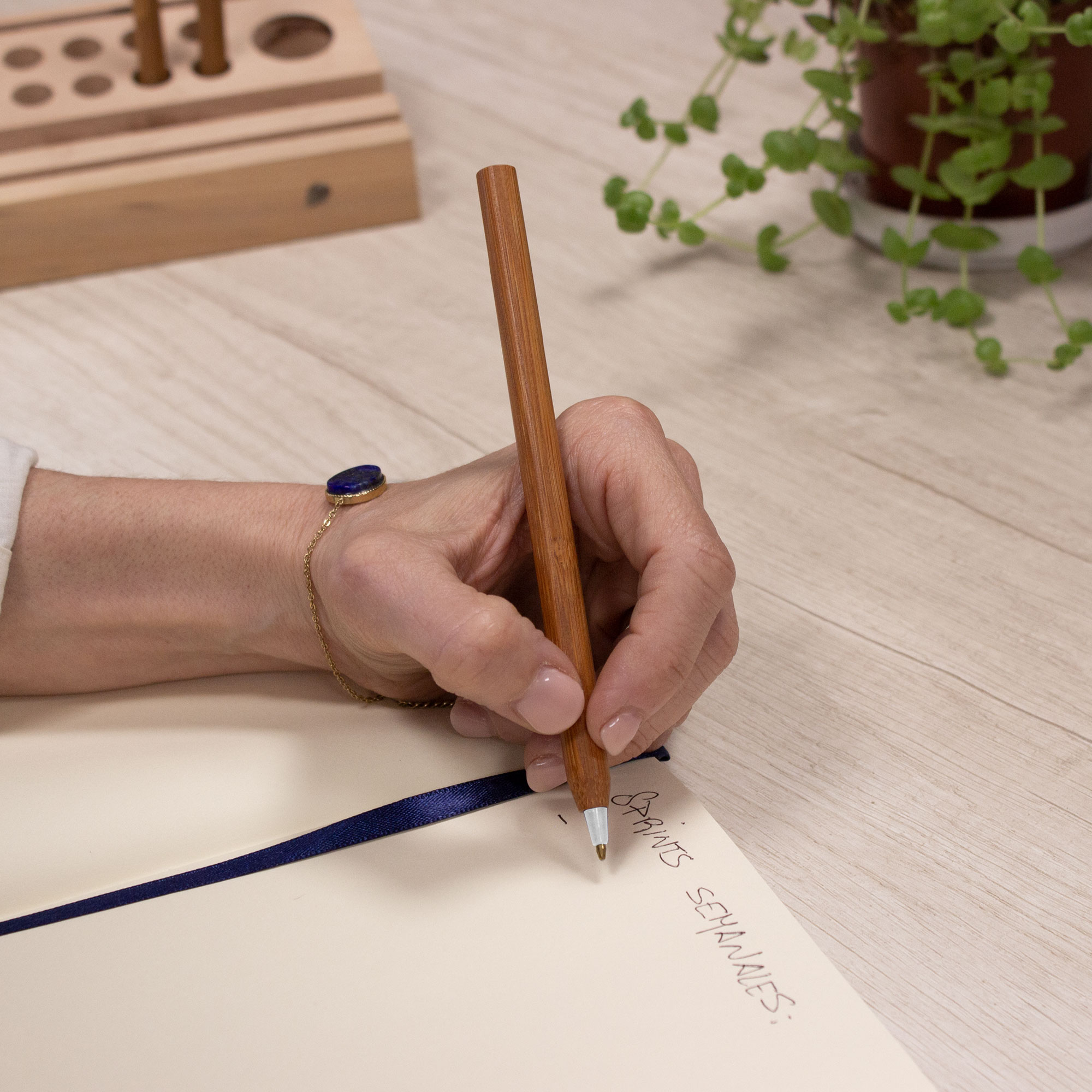 Bolígrafo con cuerpo de bambú y punta plástica de diferentes colores. Tinta Negra.