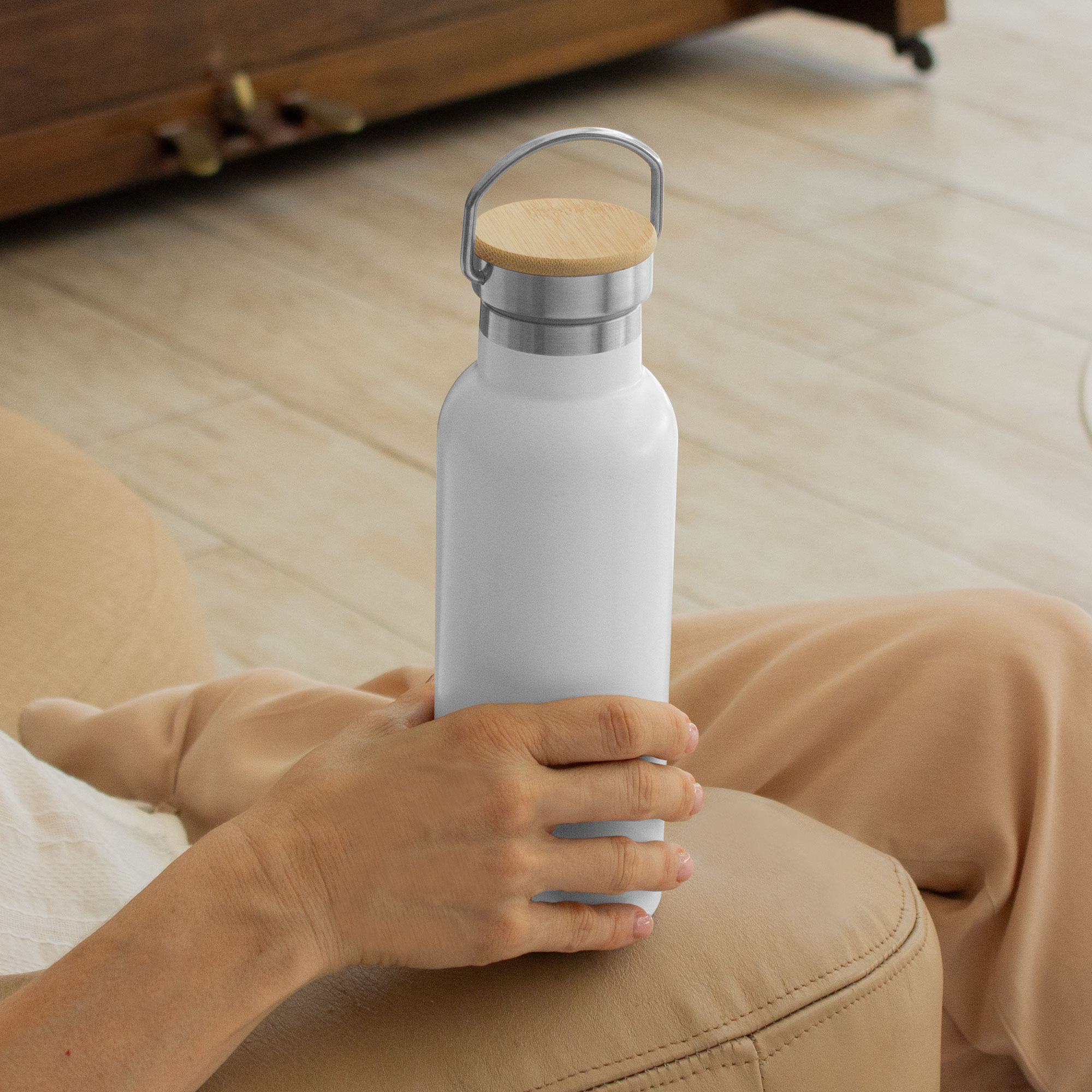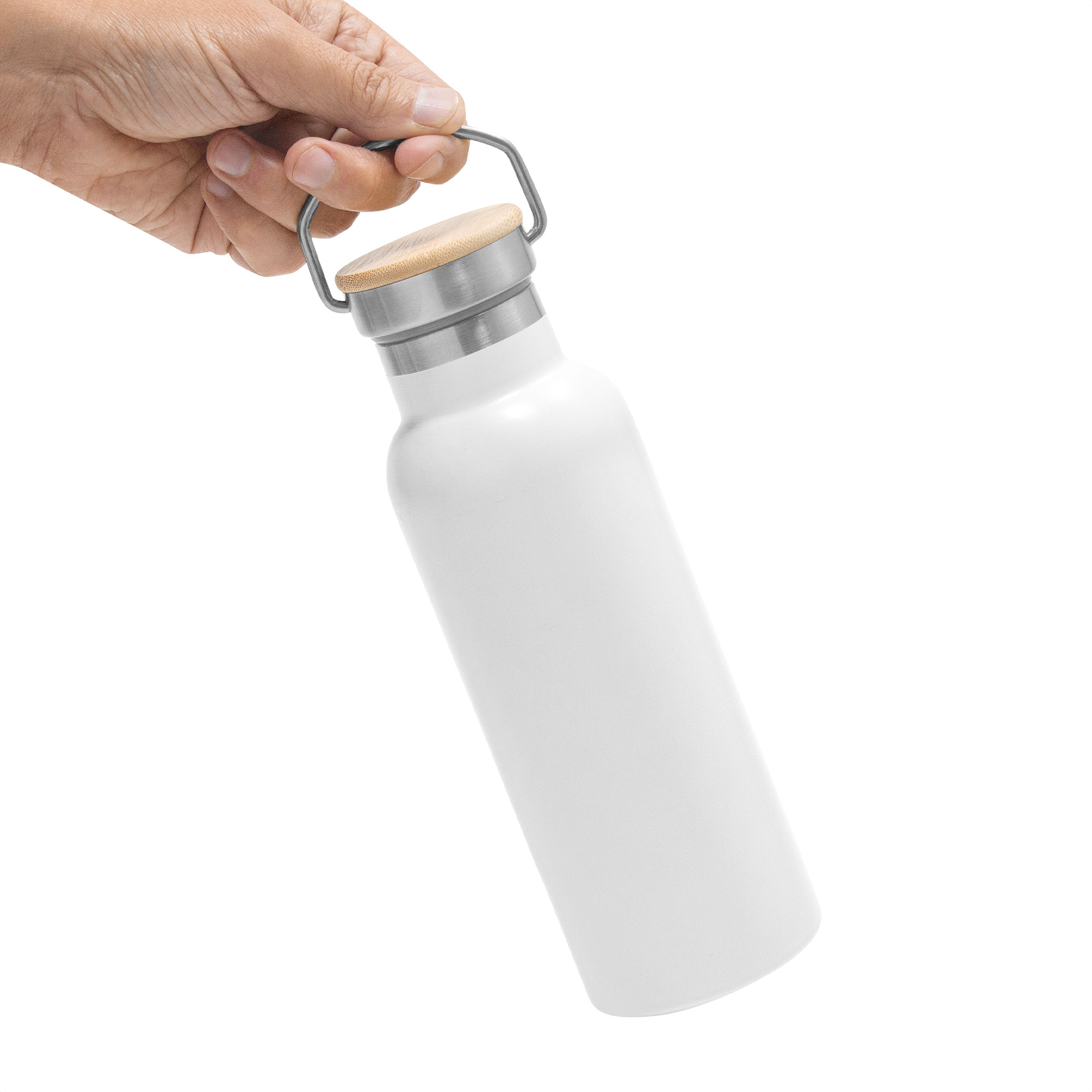 Ø 7,2 x 22,3 cm. Capacidad 550 ml. Acero inoxidable. Botella con aislamiento térmico vacuum. Interior en acero 304 y exterior en acero 201. Tapa de acero inoxidable con manija metálica rebatible y detalles en bambú. Anillo de silicona antiderrame. Mantiene hasta 12 hs la temperatura de las bebidas calientes y 24 hs de las bebidas frías. Presentación en caja de regalo Kraft.