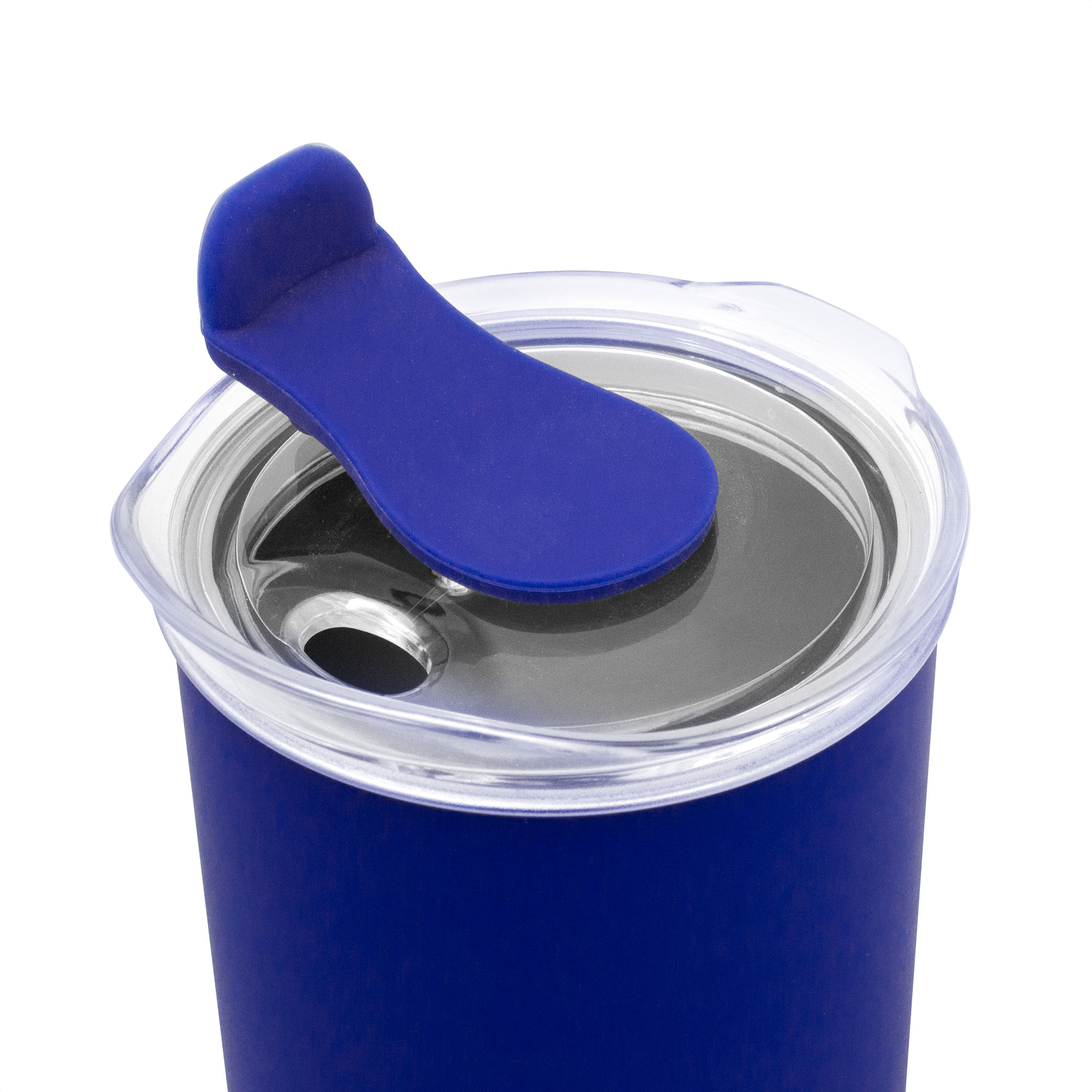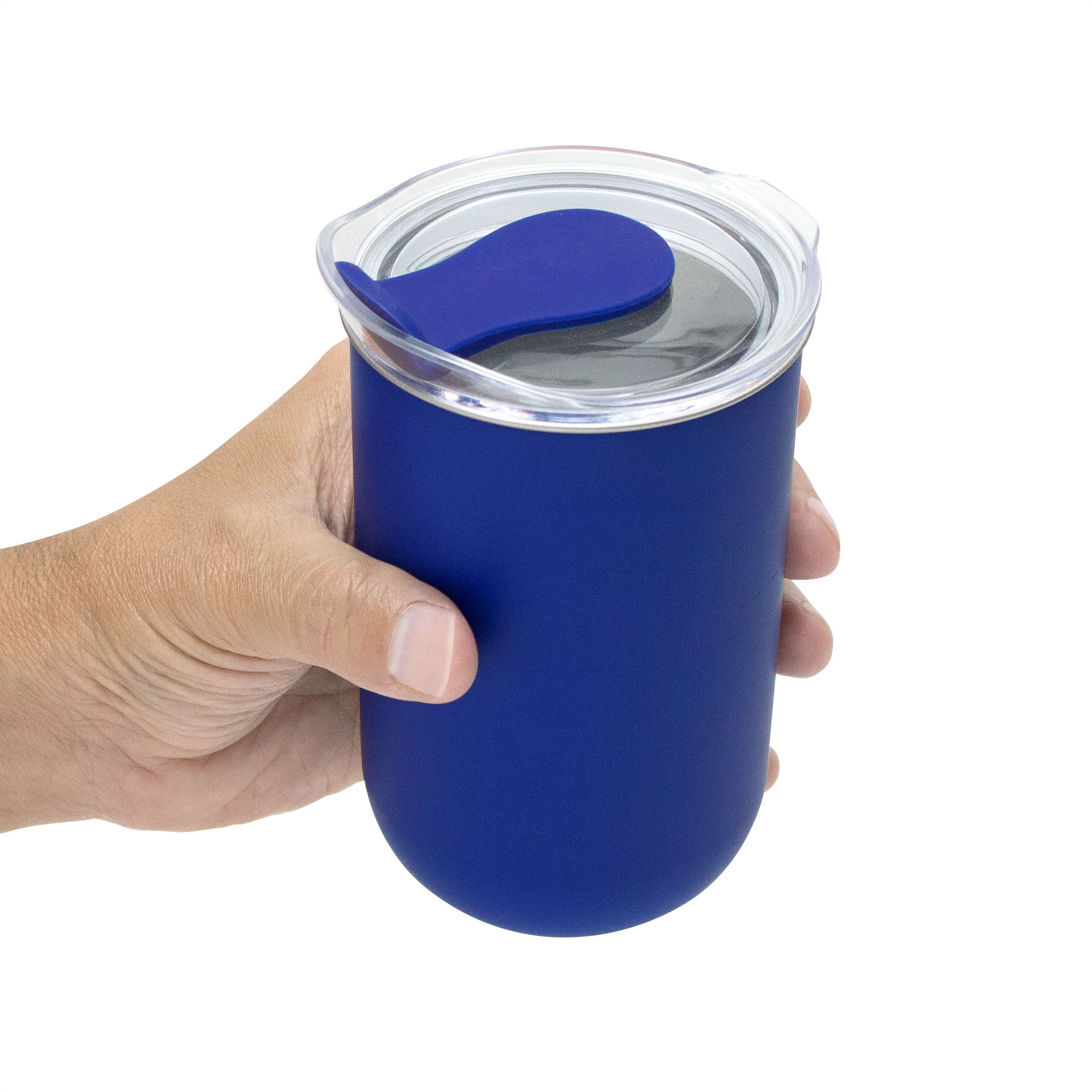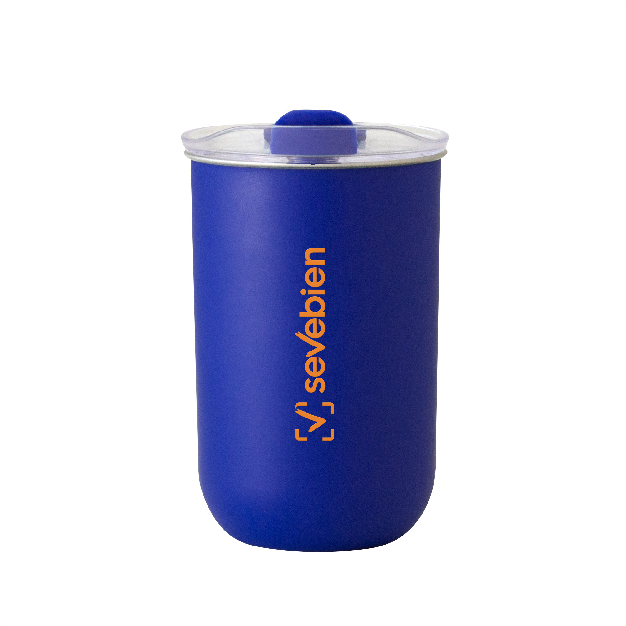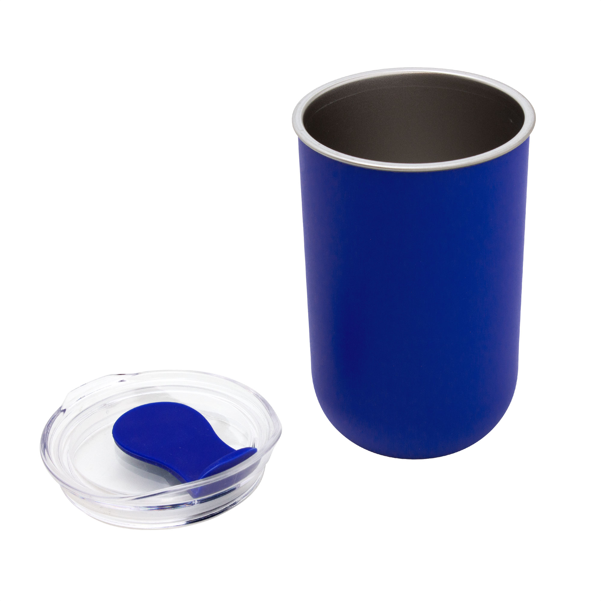 Mug doble Pared. Interior de acero inoxidable 304 y exterior de polipropileno. Pintura acabado mate. Tapa plástica transparente a presión con anillo de silicona y cierre de silicona a tono con el color del cuerpo. Mantenga el tapón abierto si utiliza agua caliente.