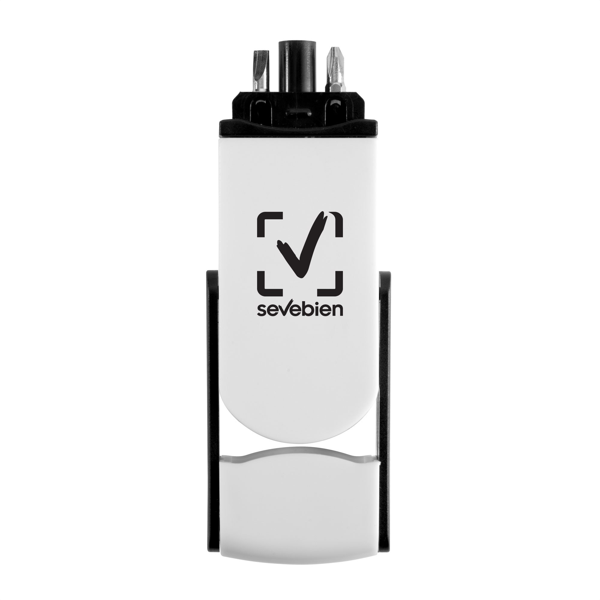 Set de destornillador con 2 puntas intercambiables ocultas (plana de 3,5 mm y phillips de 2mm.) Ambas en CR-V que las hace más durables y resistentes a la corrosión. Incluye cinta métrica de 1 m. con escalas en centímetros, pulgadas y pies. Cuerpo imantado para poder fijar las puntas. Apertura por deslizamiento.
